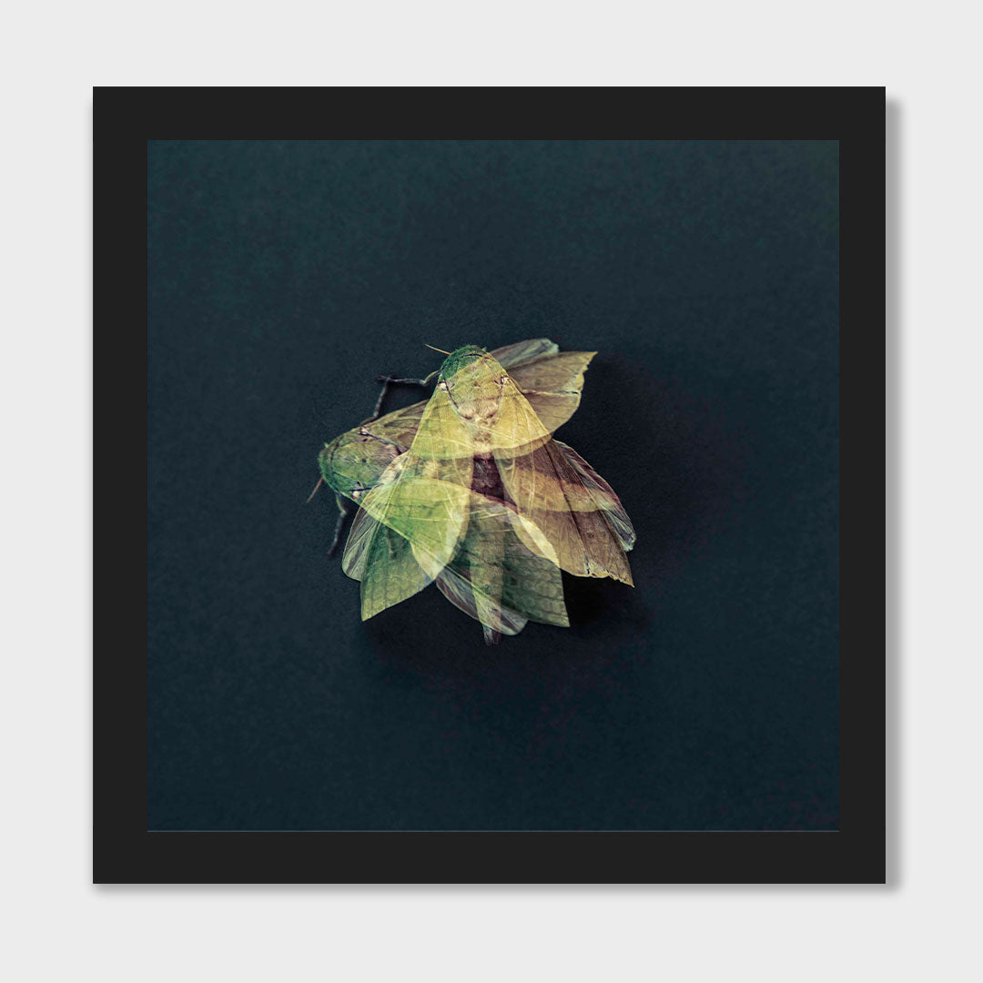 This digital print of a found, deceased Puriri Moth discovered in the artist's garden was made using a digital exposure method. The moth was transported into the artist's studio and photographed at various angles to translate into an image that seems to flit off the paper.